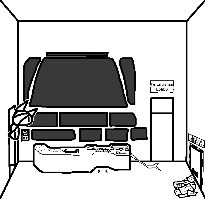 examine those little teeth-like things on the floor just in front of the consoleBefore the obvious take/read notes, take staff, etc., cautiously open electrical maintenance hatch with BLUDGEONY SHOVELCANE -- The wooden end, just in case there's a current.