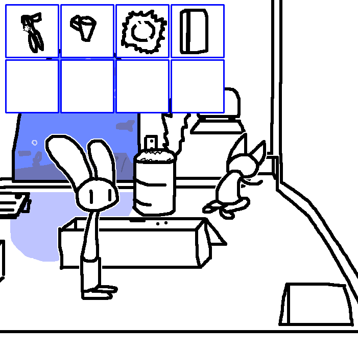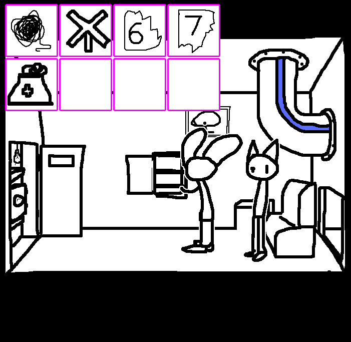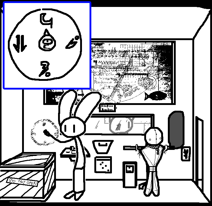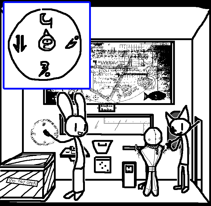 Yeah, CAN OPENER, TWO COINS, PAIR OF GLOVES, SMALL CHEST and CHART WITH SYMBOLS Try and combine each of the items with each other in any and all ways that would not destroy any of the items. Adventure games YUCK FEAH
