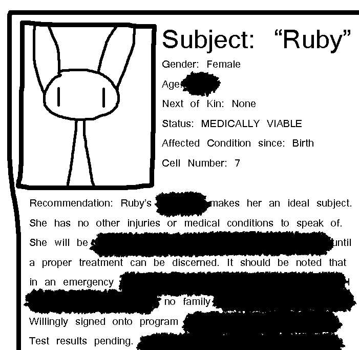 Damn, if we had a cell phone we could call Tank and have him upload hacking knowledge into Ruby's head. Okay, first off, can I get a loadout of all of Ruby's abilities, general knowledges, and physical capabilities?Well, shit, she's a rabbit. There's some wire. Chew on that shit!