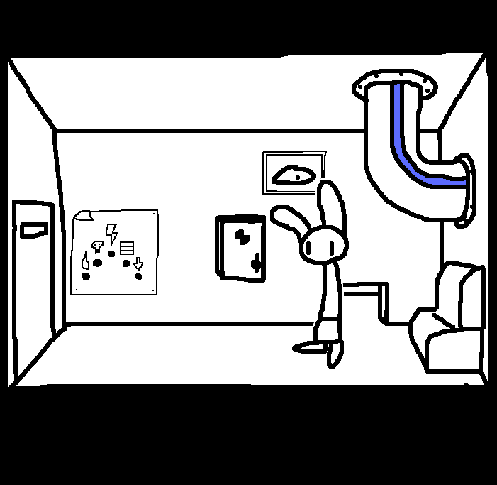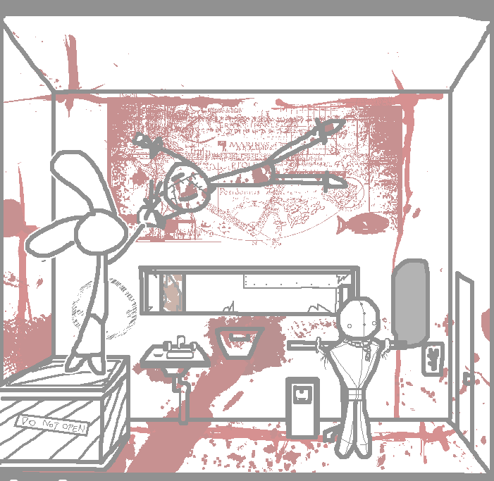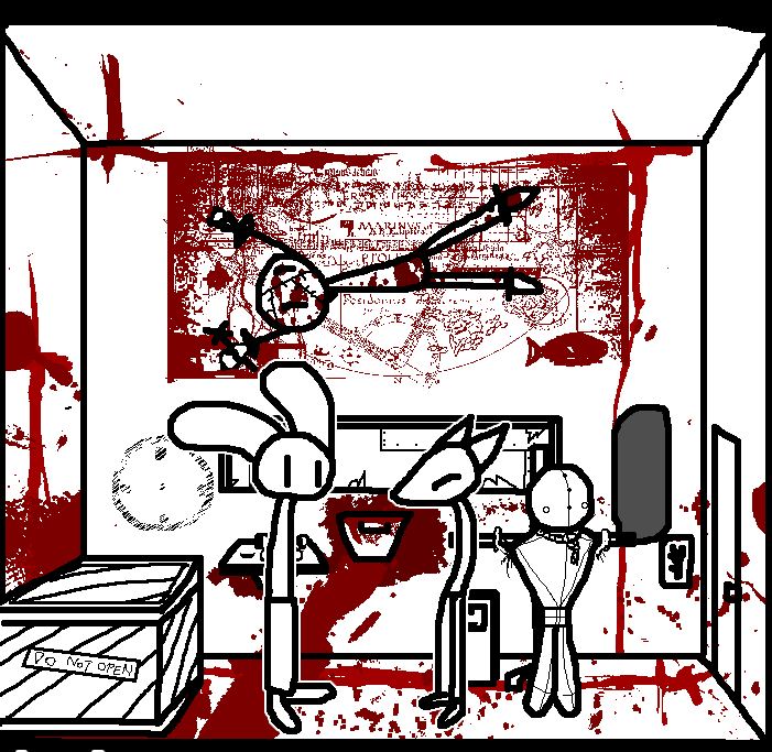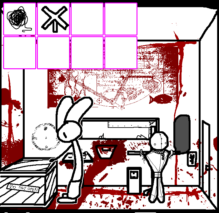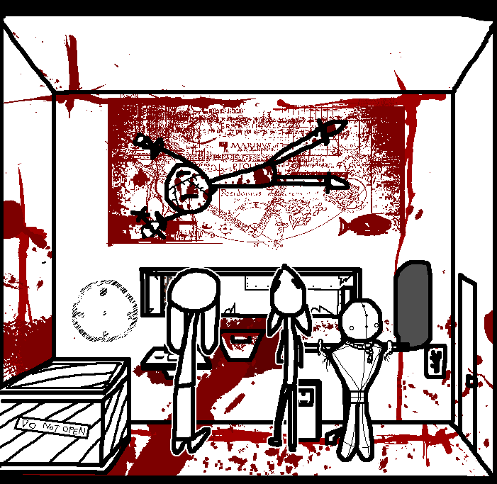 Tell Ruby to inspect the sign. The middle one is electrocution, the second from the right has a grate sign, the one after has an arrow, but I don't know the other two. The one of the second left is death so avoid that and I'm guessing the far left is water. Tell Tom to press the one, from his side, the second from the left for him which will be the second from the right on this side saying the grate. Inspect what looks like a safe on the wall in this room. Inspect what looks like a portrait of a fish on this side of the room. Look through what looks like a grate in the door to the left of the room.SWEET CHRIST IS THAT BLOOD? Take down picture of fish...